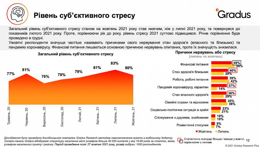 Рівень суб’єктивного стресу, що вимірюється компанією Gradus Research вже другий рік поспіль, демонструє подальше зростання. Пікових значень високий рівень стресу набуває у літні періоди, коли ділова та робоча активність припиняється і основними причинами стресу стають страхи фінансової нестабільності та збіднення. Однак зараз, на відміну від літа, поряд із фінансовими та робочими питаннями, як факторами стресу, виникають страх за здоров’я близьких та пандемія загалом.