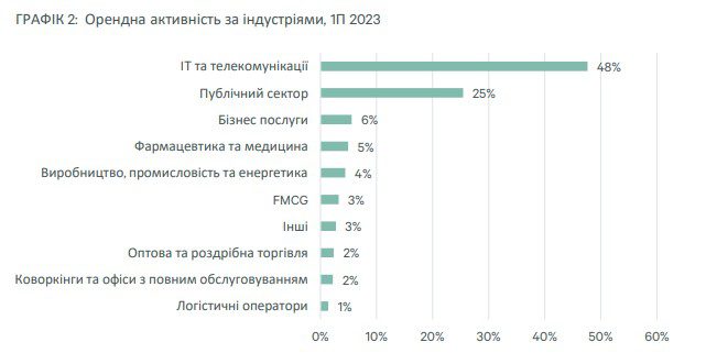 Державний сектор та неурядові організації, однак, значно збільшили свою частку до 25% (+11 п.п. 48%з початку року) з початку війни, оскільки багато організацій розширили свою діяльність в країні. Водночас, сектор фармацевтики та медицини зменшив свою частку до 5% (-26 п.п. з початку року), так як основні гравці галузі забезпечили свої потреби в офісних приміщеннях, продовживши існуючі договори оренди протягом 2022 року.