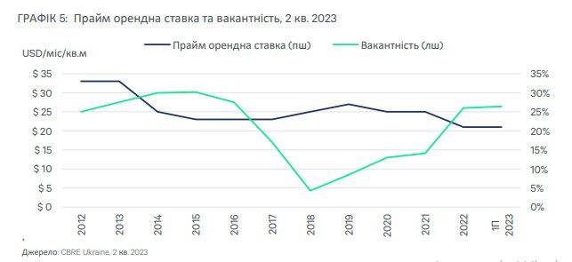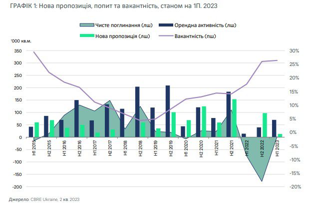 Станом на кінець 1П 2023 року вакантність на ринку офісної нерухомості становила 26,4%, незначно збільшившись на 0,4 п.п. з кінця 2022 року. Починаючи з 1 кварталу 2023 року, обсяг вакантних площ ефективно збалансовувався обсягом поглинутих площ, що призвело до певної рівноваги між попитом і пропозицією, вперше з початку повномасштабного вторгення. Однак ринок все ще недостатньо стабільний, і будь-яке подальше погіршення безпекових чи економічних умов може призвести до того, що він набуде більш негативних значень.