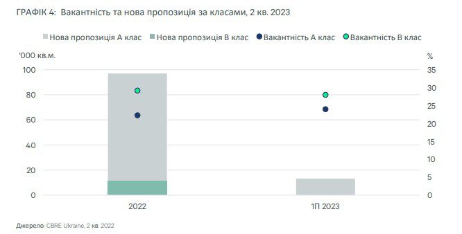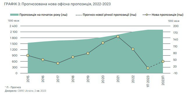 Повномасштабна війна залишила на ринку численні об'єкти з незавершеним будівництвом. Разом з тим, кілька офісних проєктів, спочатку запланованих до завершення у 2023 році, були призупинені щонайменше до 2024 року. Варто зазначити, що у 2022 році не було зафіксовано жодного нового девелоперського проєкту, і малоймовірно, що вони будуть зафіксовані до кінця 2023 року. Отже, протягом наступних 2-3 років обсяг офісної нерухомості може зрости лише за умови перезапуску призупинених девелоперських проєктів.