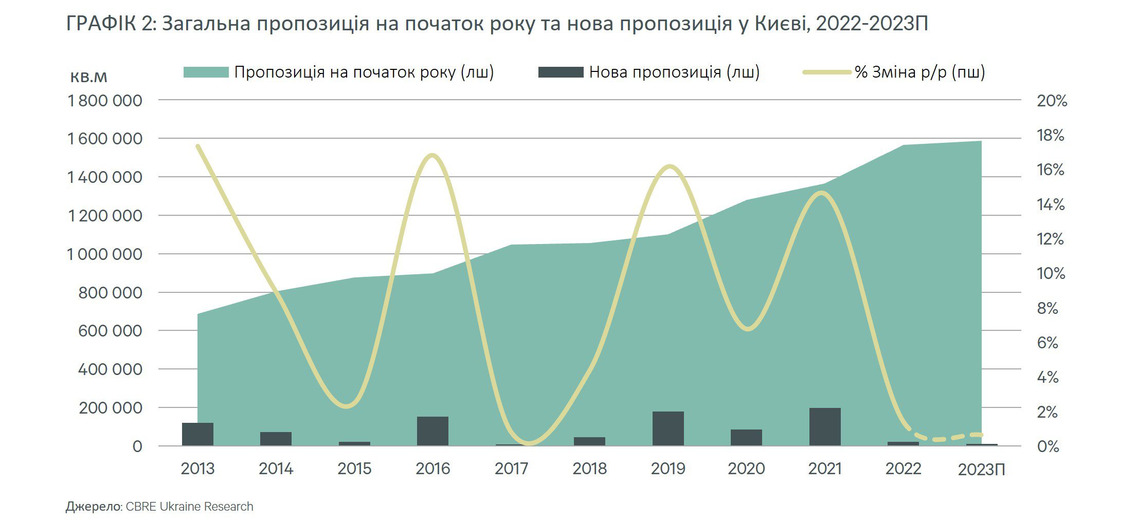 Особливістю ринку під час нинішньої кризи є те, що задекларовані обсяги будівництва залишаються високими, незважаючи на те, що будівельні роботи практично повністю відсутні. Близько 300 000 кв. м сучасних торговельних площ перебувають на різних стадіях будівництва, причому близько 70% з них активно будувалися до війни і були заплановані до виходу на ринок у 2022-2023 роках. Однак реальність така, що через невизначеність щодо тривалості війни та відновлення споживчого попитуб терміни завершення більшості проектів, швидше за все, будуть відкладені на 2-3 роки.
