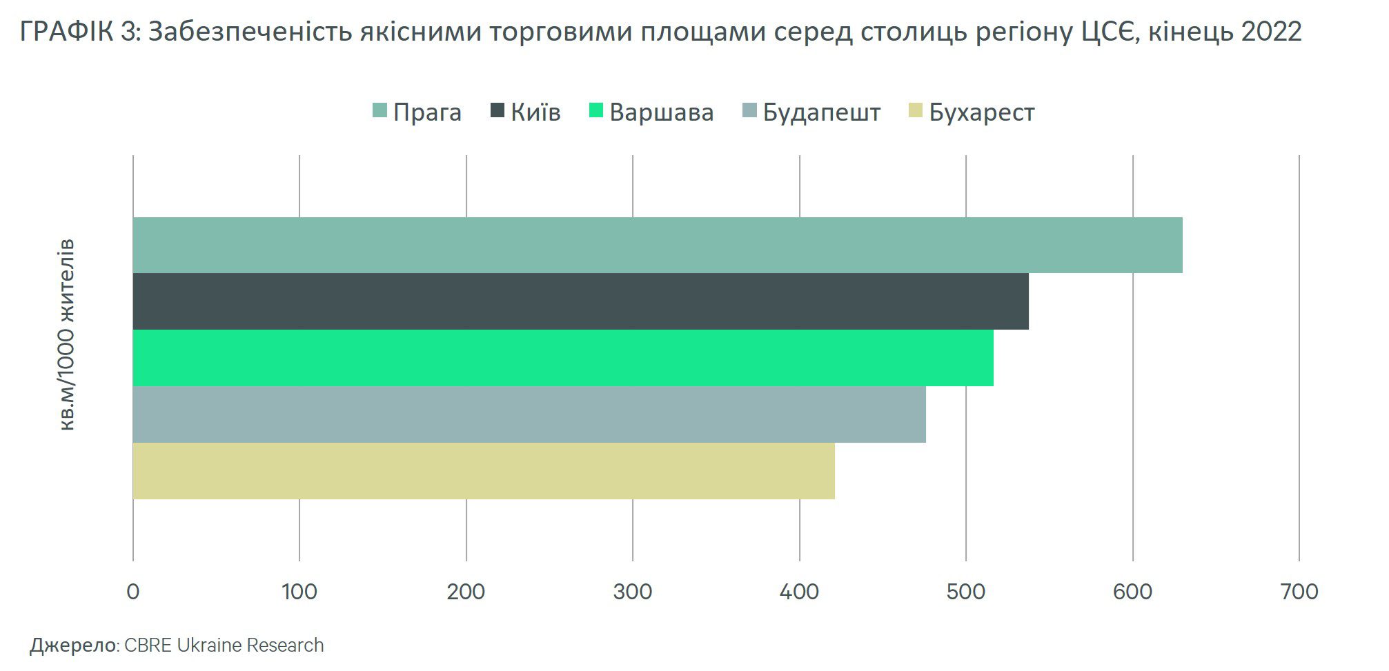 забезпеченість якісними торговими площами на 1 000 мешканців у Києві є більшою ніж у Варшаві, Будапешті та Бухаресті.