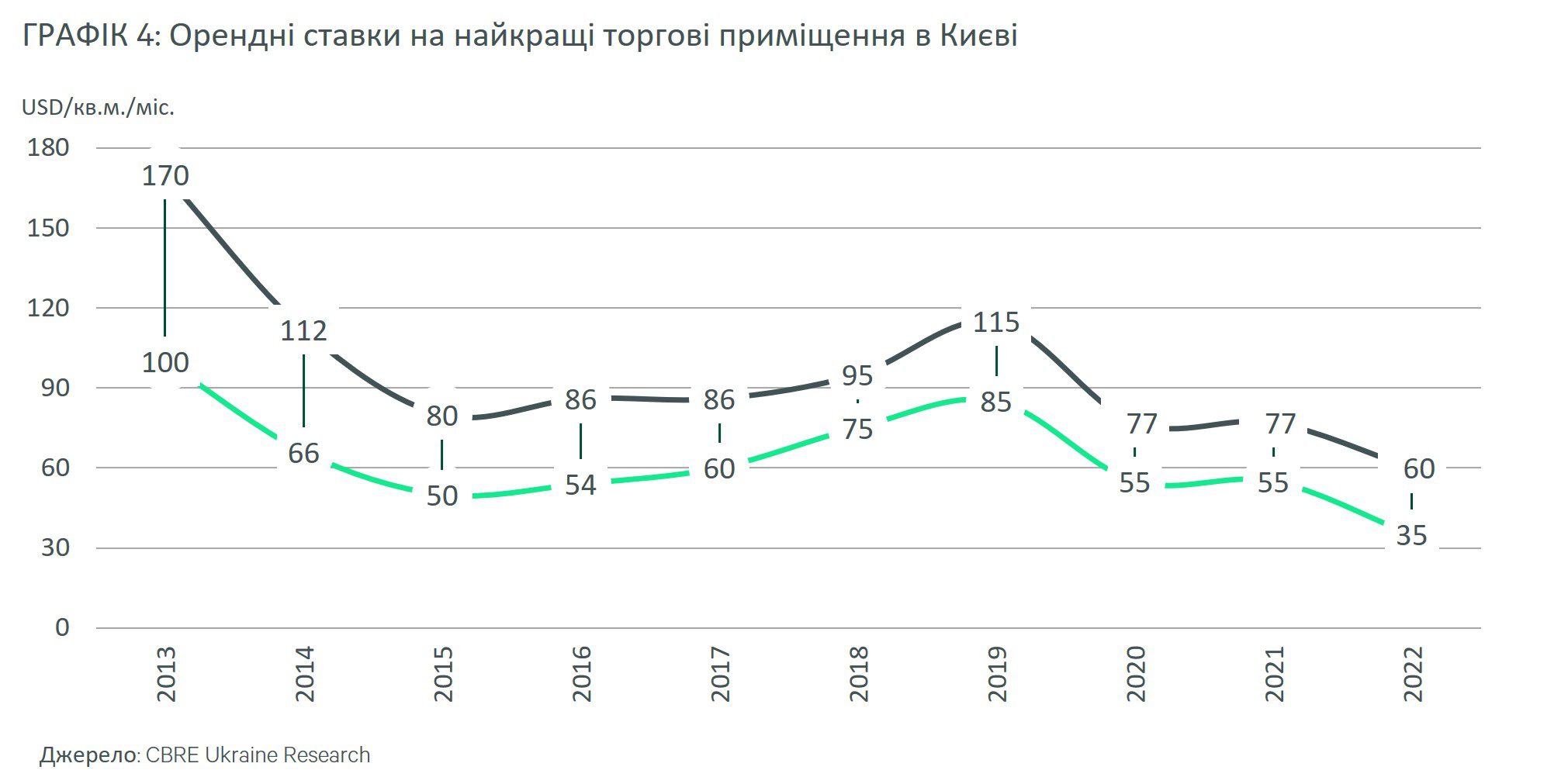 Упродовж 2022 року рівень орендних ставок коливався залежно від локації, типу торговельного центру та рівня заповнюваності. Як і в інших сегментах нерухомості, умови оренди значною мірою залежали від індивідуальних домовленостей між орендарем і орендодавцем, зосереджуючись на короткостроковій оренді та знижках на оренду в діапазоні від 30% від довоєнного рівня або орендної плати, лише як відсотку від роздрібного товарообігу орендаря. Проте до кінця року ринок дещо стабілізувався, оскільки населення міста наблизилося до довоєнного рівня. В результаті, орендна ставка на найкращі торгові приміщення (включаючи відсоток від роздрібного товарообігу) коливалася в діапазоні $35-$60/кв.м/міс (-30% в середньому з поч. року) для типової торговельної галереї площею 100-200 кв.м, а базові ставки на інші торгові приміщення варіювалися в діапазоні $14-$29/кв.м/міс (-55% в середньому з поч. року).
