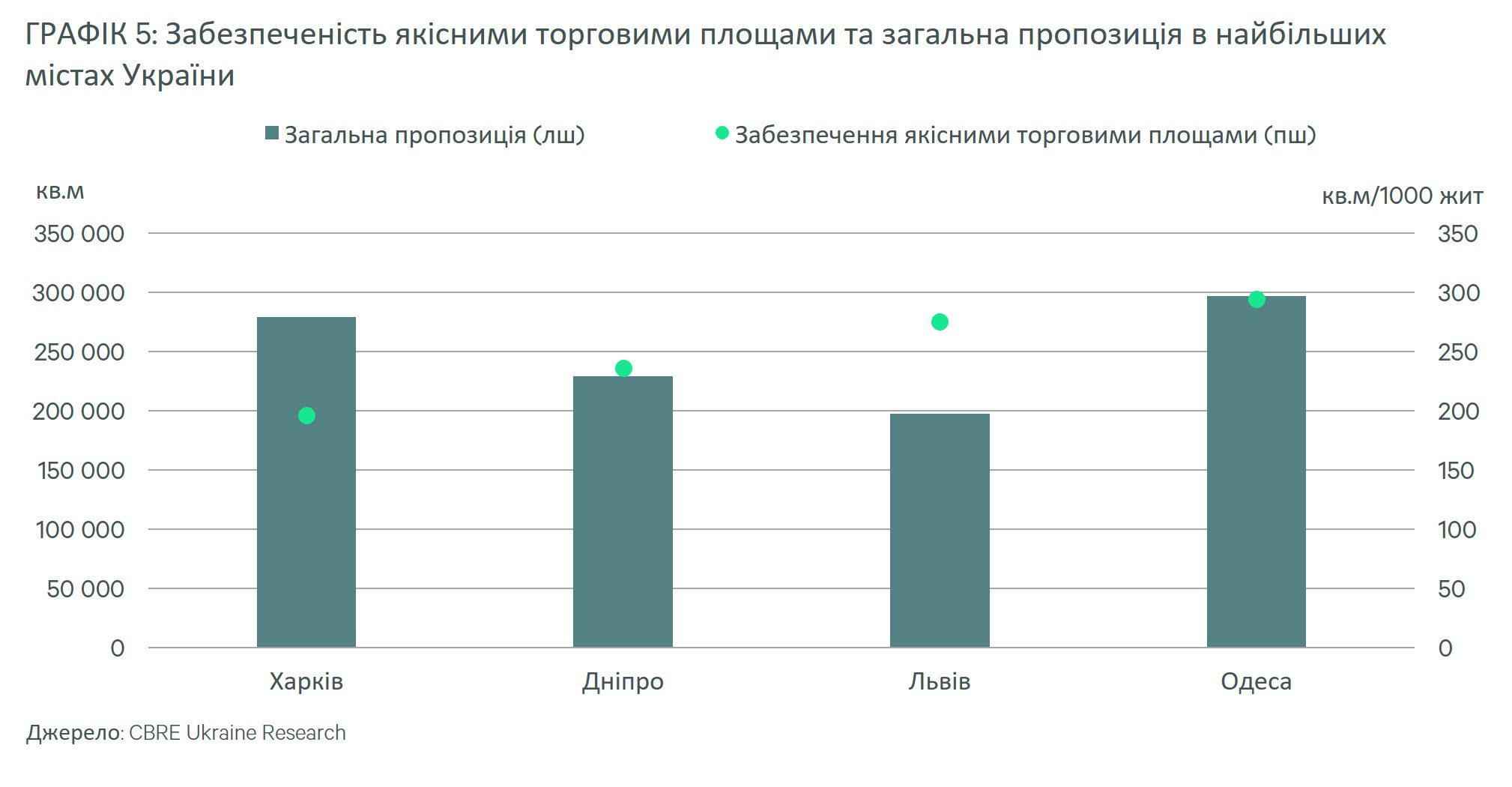Зокрема, протягом 2022 року у великих містах було введено в експлуатацію п'ять торгових об'єктів, серед яких спеціалізований ТЦ Епіцентр (GLA 75 000 кв.м), ТЦ Fabrik (GLA 9 500 кв.м) і ТРЦ ЛАЗ-695 (GLA 9 000 кв.м) у Львові, ТЦ Happy Mall (GLA 7 800 кв.м) у Рівному та ТЦ Pannonia (GLA 6 500 кв.м) в Ужгороді. В результаті, річний обсяг нової пропозиції торгової нерухомості у регіональних містах склав 108 000 кв.м, що приблизно на 21% більше, ніж у минулому році. Завдяки такому обсягу пропозиції забезпеченість якісними торговими площами на 1 000 жителів зросла у Львові до 374 кв.м (+45% з початку року), тоді як в інших найбільших містах регіону цей показник залишився практично незмінним: 294 кв.м в Одесі, 196 кв.м у Харкові та 236 кв.м у Дніпрі.