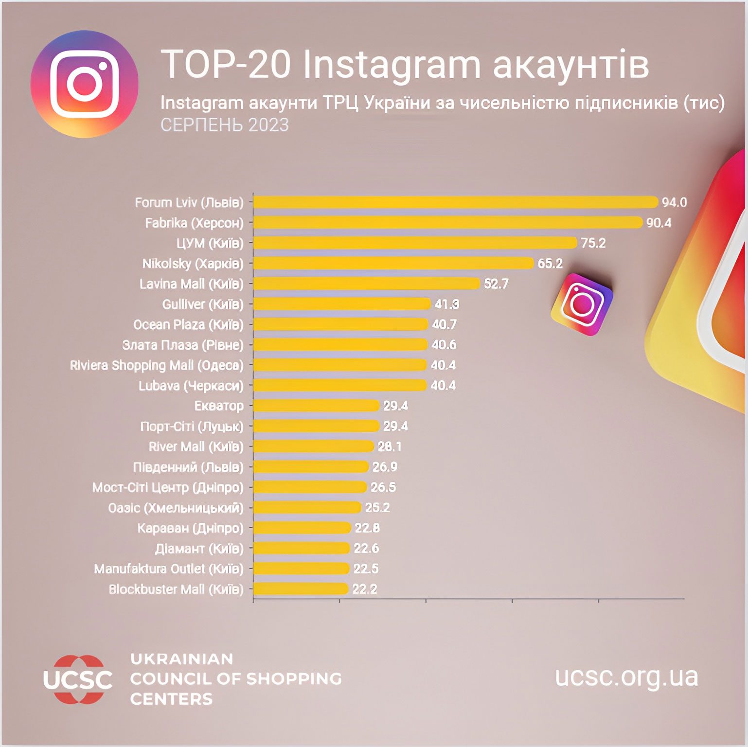 Українська Рада Торгових Центрів проаналізувала сторінки вітчизняних ТРЦ у соціальних мережах Facebook та Instagram, і представляє рейтинги з ТОП-20 акаунтів за кількістю підписників, за підсумками літа 2023.