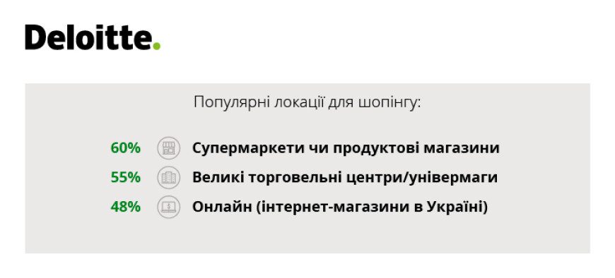 Пріоритетними локаціями для закупів визначені супермаркети чи продуктові магазини (60%), великі ТРЦ (55%). Онлайн-покупкам віддають перевагу 48% українців.