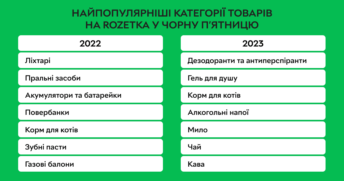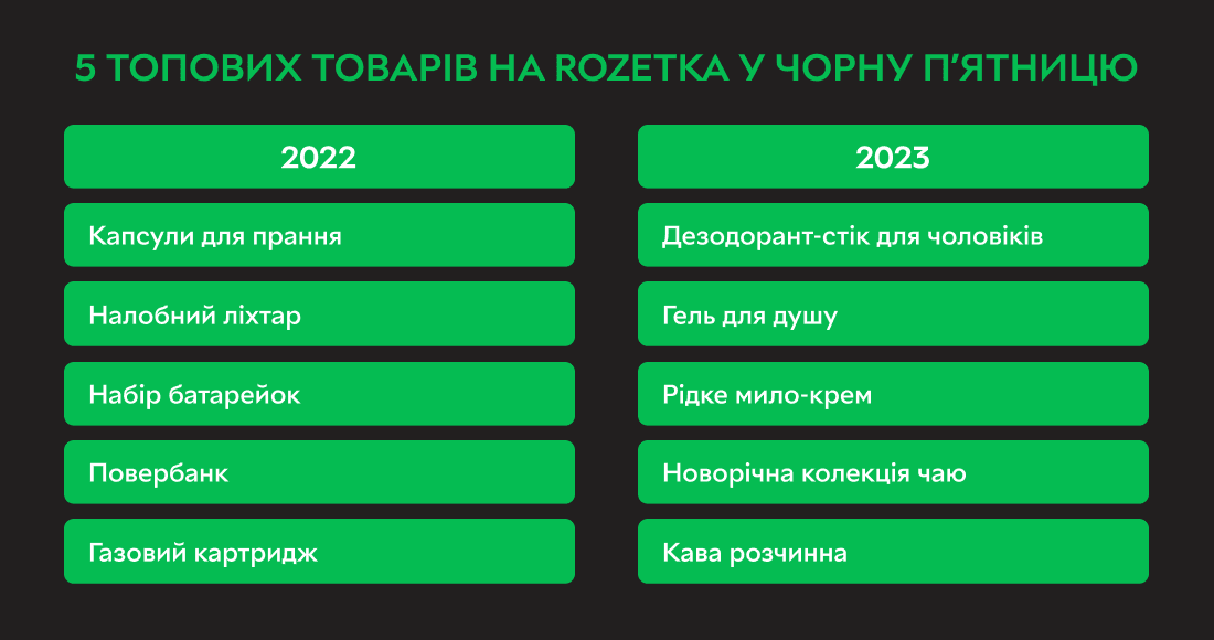 Товари, які мають найбільший попит у топових категоріях цього року, також відрізняються від минулорічних. Ще у Rozetka помітили, що для отримання замовлення покупці на 25% частіше обирають доставлення кур'єром, тоді як на Чорну п'ятницю у 2022-му кур'єрським доставленням користувались на 12% частіше.