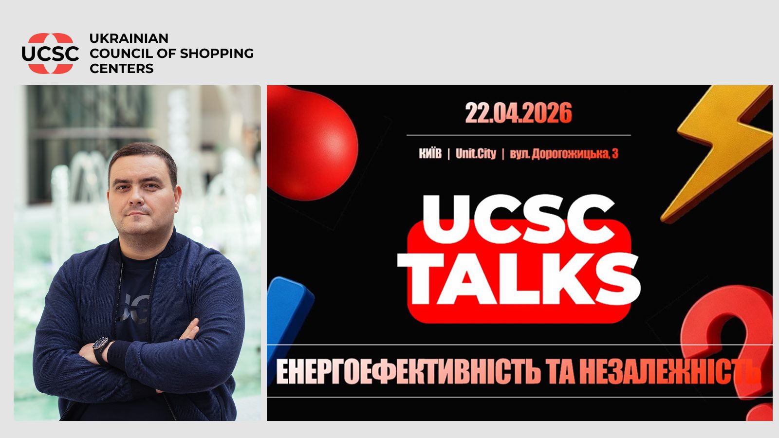 Нагадаємо, Українська Рада Торгових Центрів запрошує приєднатися до професійної конференції UCSC TALKS 2026, присвяченої енергоефективності та енергонезалежності бізнесу. Подія відбудеться 22 квітня у Києві, в інноваційному просторі UNIT.City, і збере представників усіх типів комерційної нерухомості, ритейлу та енергетичного сектору.