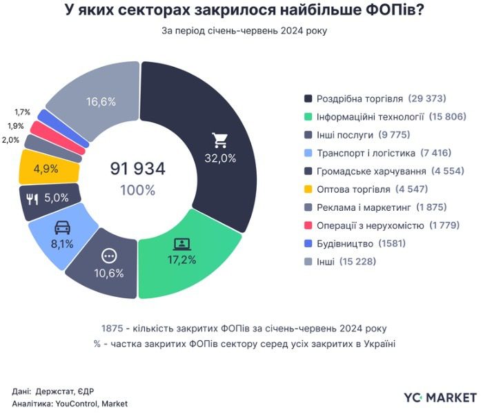Серед секторів найбільше ФОПів закрилося у галузі роздрібної торгівлі - понад 29 тис. ФОПів або 32%, приріст порівняно з минулим роком склав 44,8%.