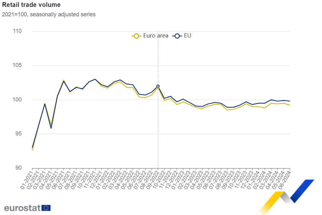 У червні 2024 року порівняно з травнем сезонно скоригований обсяг роздрібної торгівлі у єврозоні знизився на 0,3%, а у ЄС на 0,1%. Тоді як економісти, опитані агентством новин Reuters, очікували падіння лише на 0,1 відсотка після зростання на 0,1 відсотка в травні.