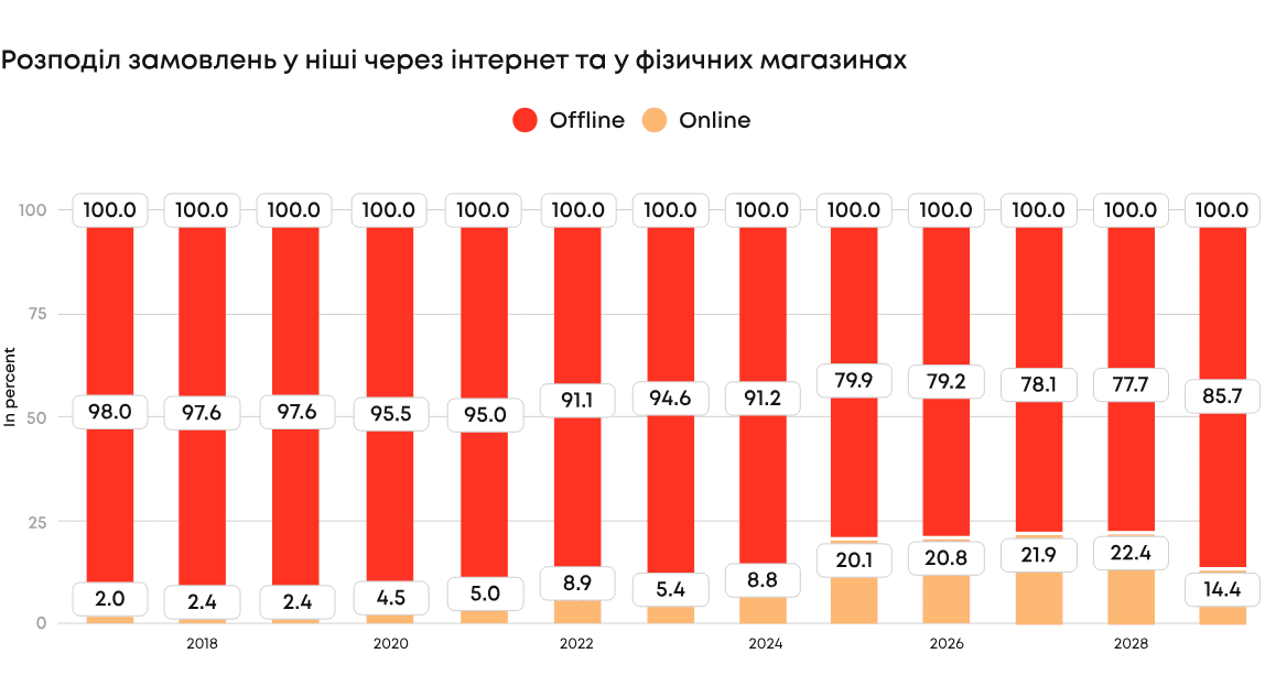В Україні зростання не таке стрімке, зокрема через війну, у ніші не стає значно більше користувачів, однак українці вже схильні купувати цю категорію саме в онлайні.