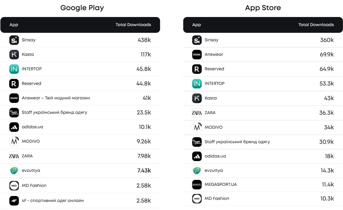 Лідерами за кількістю завантажень традиційно залишаються Answear, INTERTOP та Kasta.