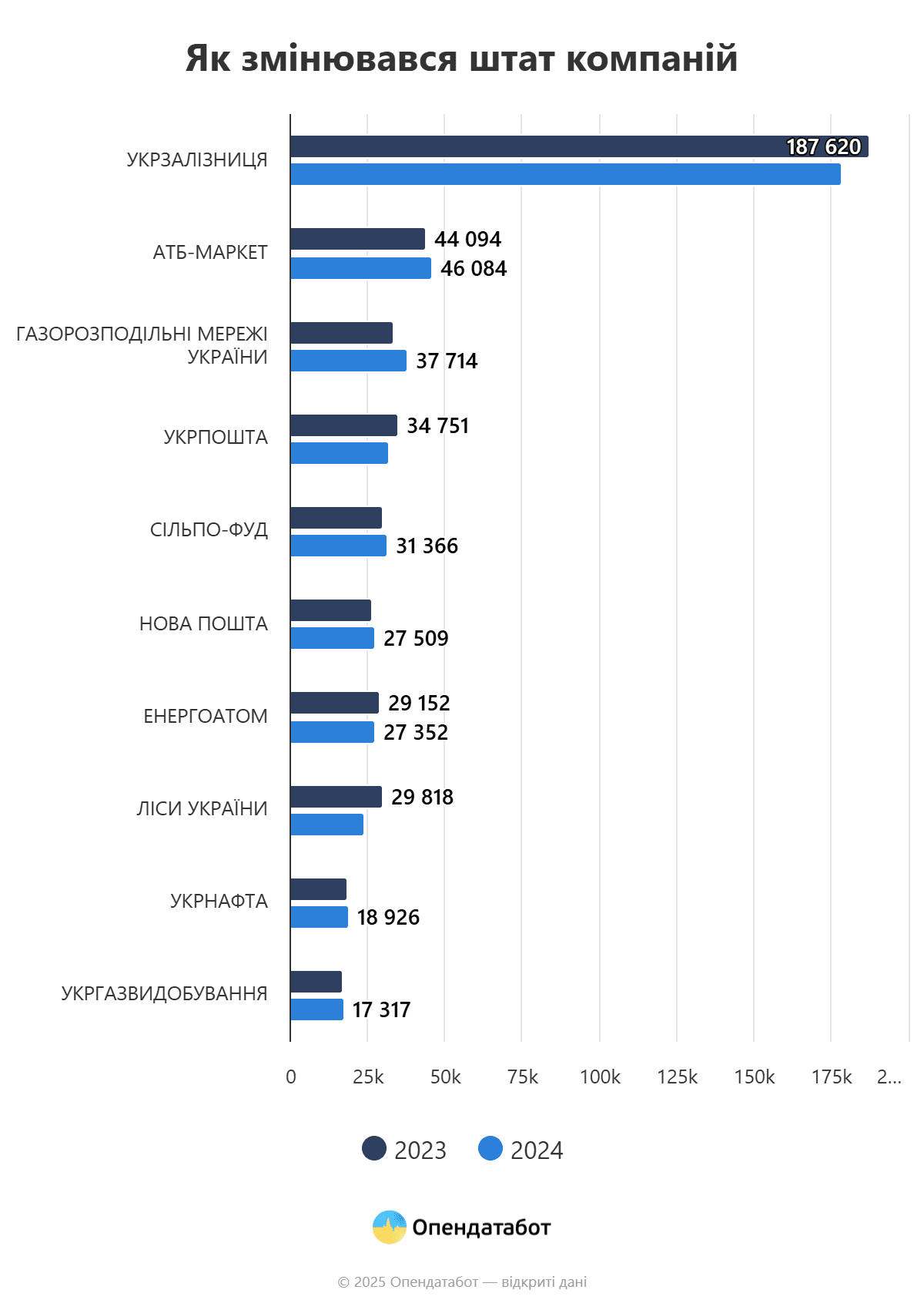 Опендатабот створив рейтинг найбільших роботодавців Україні станом на початок 2025 року на основі даних Державної служби статистики та фінансовій звітності підприємств.
