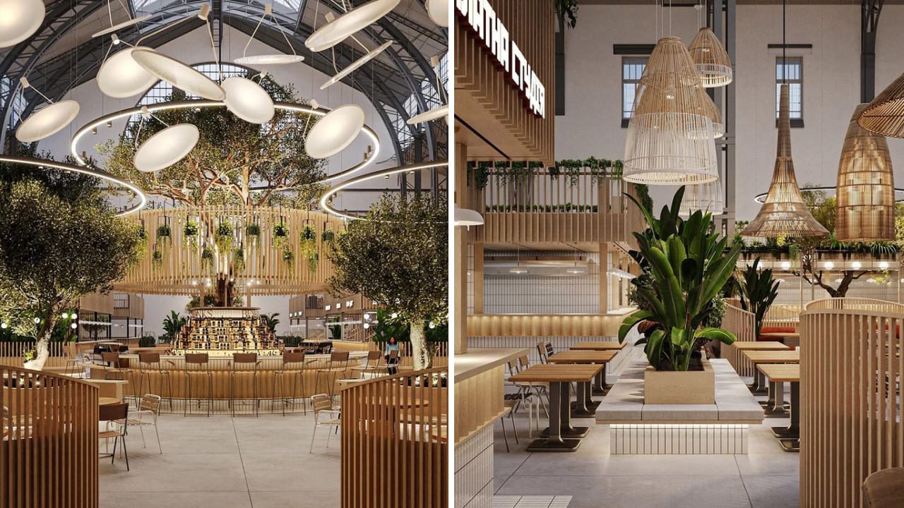 Загалом облаштували близько 400 посадкових місць у різних форматах. Столи, стільці, дивани, зелені острівці та пересувні конструкції розставлені рівномірно по периметру простору без втручання в робочі місця продавців. Також з’явилася невелика сцена для подій.