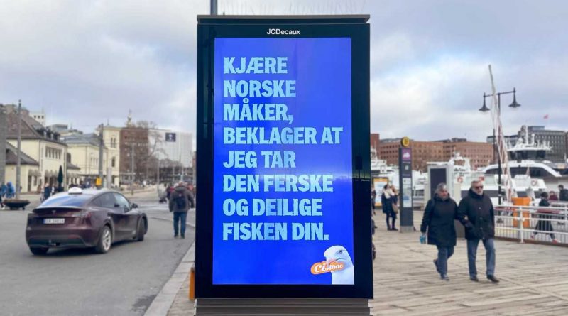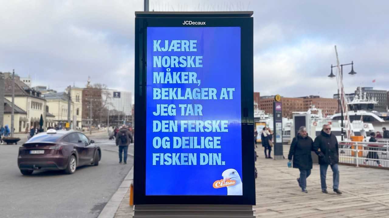 Мережа супермаркетів "Сільпо" встановила у центрі норвезької столиці Осло сітілайти з написом: "Любі норвезькі чайки, вибачте, що забрали вашу смачну і свіжу рибу".