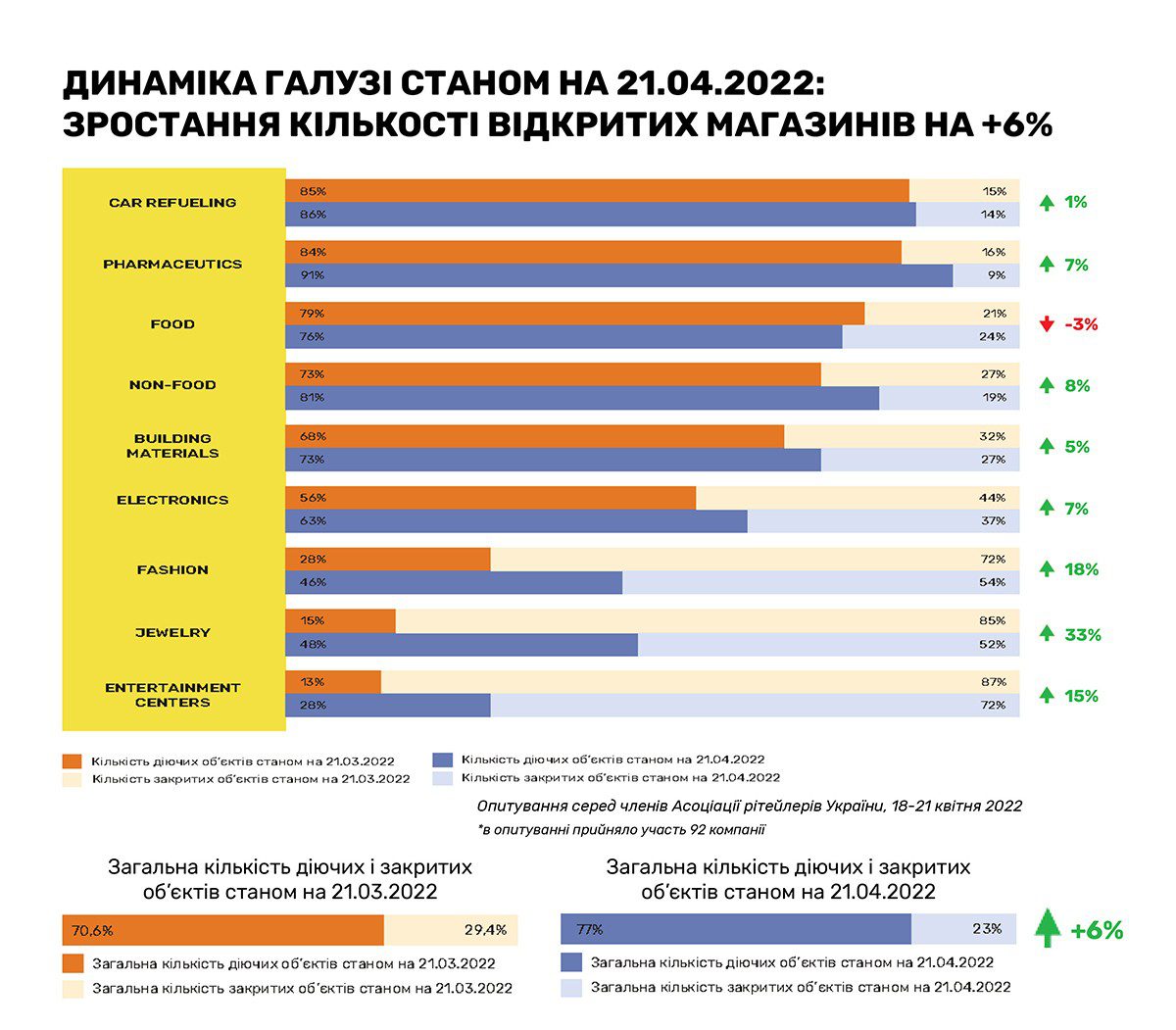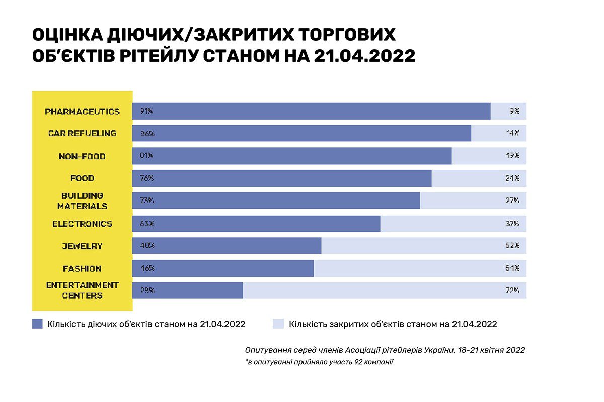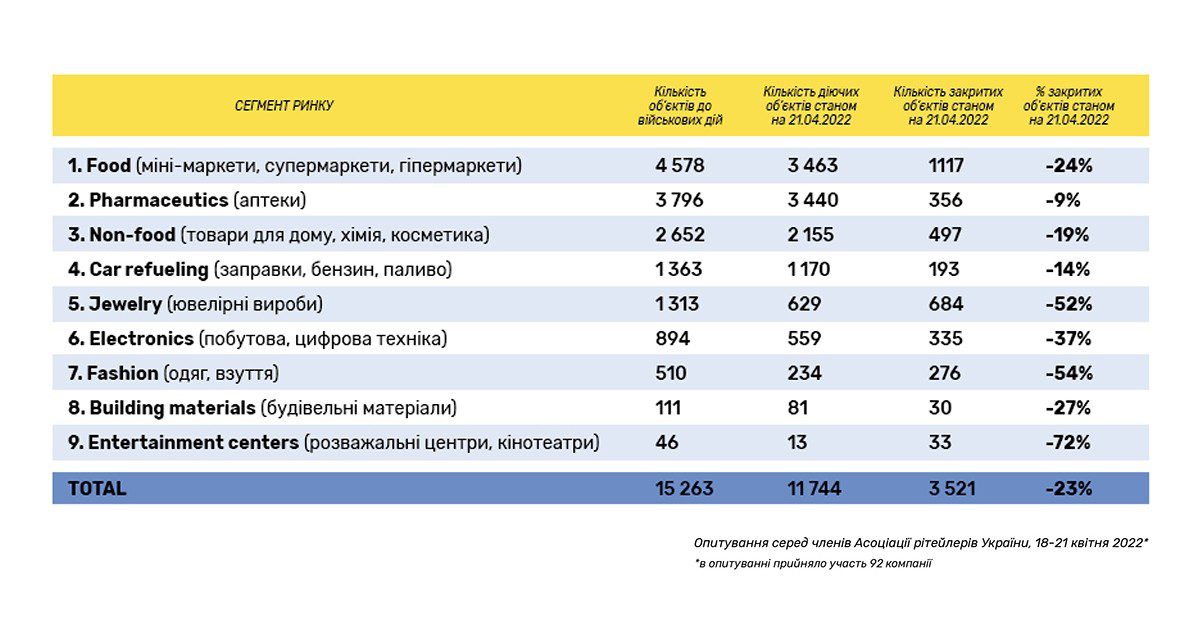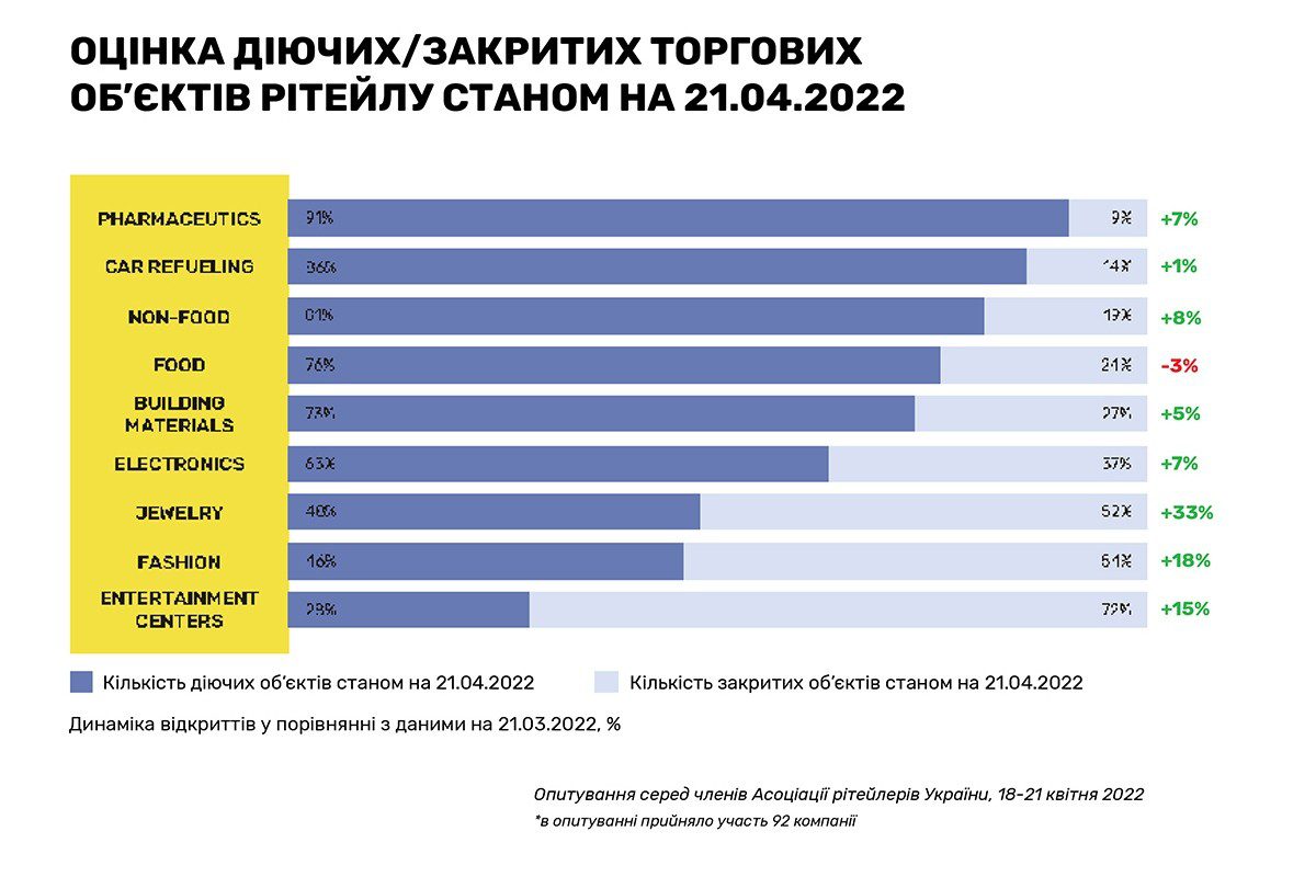 Таким чином, на 20 квітня працювало 11744 магазини з 15263, які були відкриті на момент початку повномасштабної агресії. Тобто на 23% менше – 3521 закритих точок. У порівнянні з березнем ситуація покращується, тому що відносні втрати ритейлу склали 29,4% (4481 магазинів).