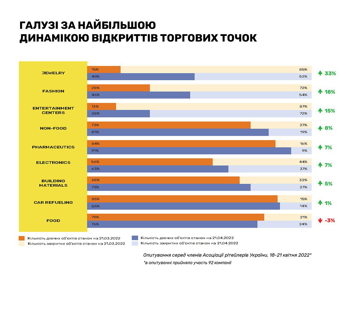 Чергове дослідження, проведене RAU у квітні методом онлайн-опитування приблизно сотні власників та CEO підприємств по всій Україні, показало, що на 56-й день бойових дій було закрито з тих чи інших причин лише 23% торгових об’єктів/магазинів. Це на 6% менше за аналогічний показник місяць тому.