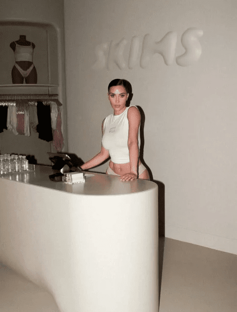 Під час презентаційного заходу засновниця та власниця бренду Кім Кардаш’ян з'явилася у класичному комплекті нейтральних відтінків від SKIMS та прозорому взутті на підборах.