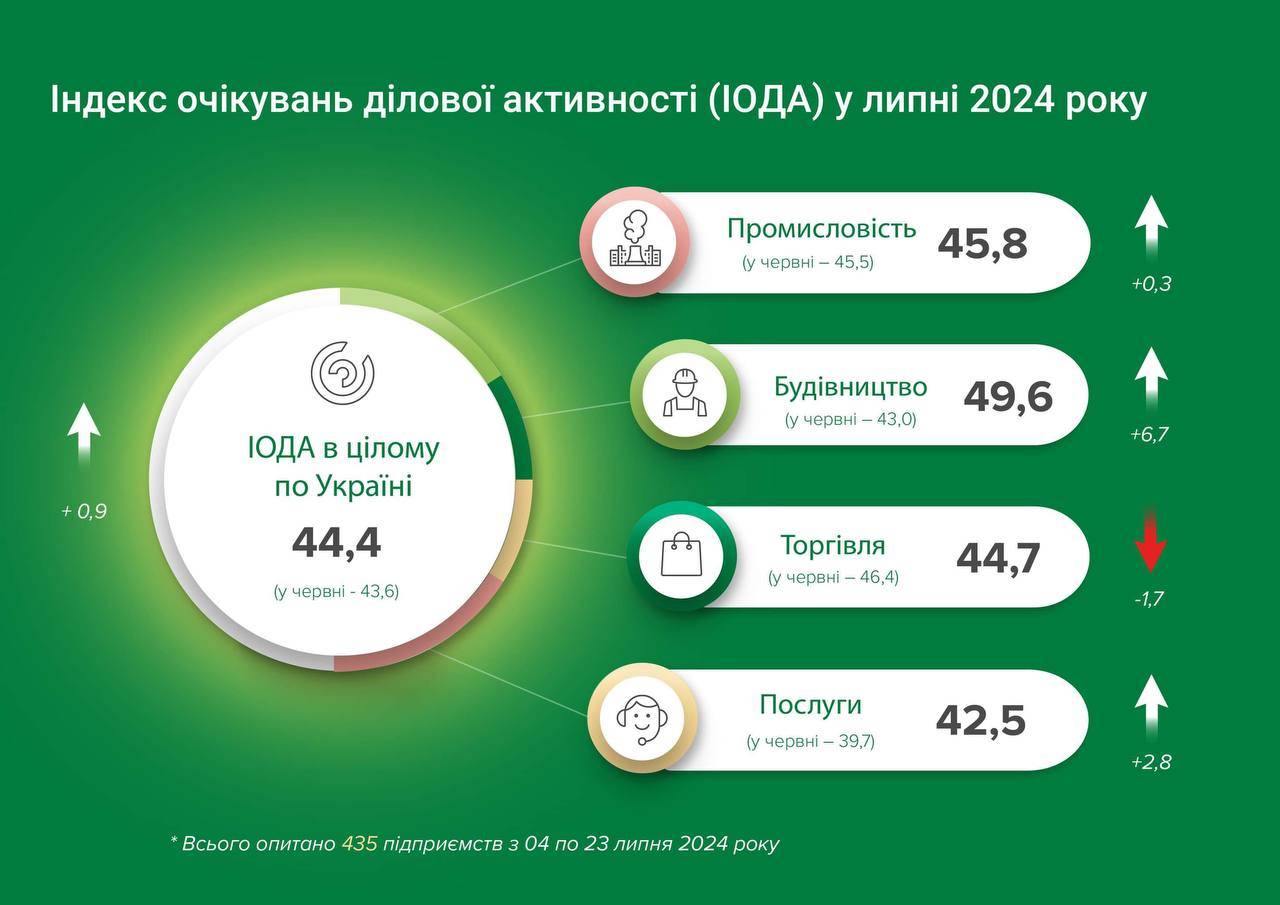 У липні 2024 року індекс очікувань ділової активності (ІОДА) зріс до 44,4 з 43,6 у червні. Втім, погіршення безпекової ситуації та дефіцит кадрів стримують активність бізнесу, тож очікування залишаються негативними.
