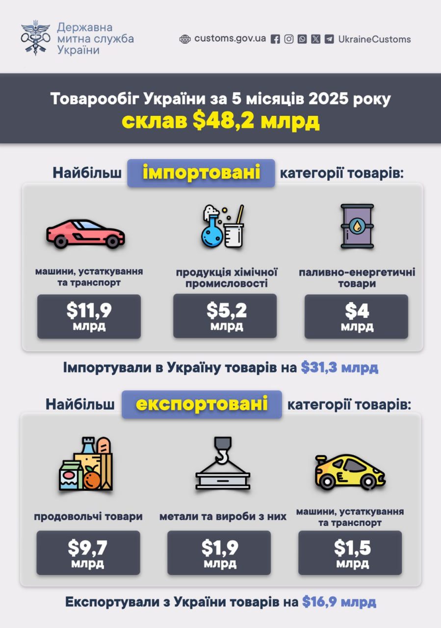 Товарообіг України у січні-травні 2025 року склав 48,2 млрд доларів. Протягом цього періоду в Україну імпортували товарів на суму 31,3 млрд доларів, а експортували – на 16,9 млрд доларів.