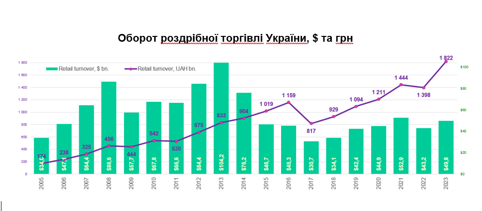 У доларовому еквіваленті оборот роздрібної торгівлі у 2023 році склав 49,8 млрд доларів на відміну від 43,2 млрд у 2022-му, що на 15% вище. Зростання товарообігу відбулося у дуже складних умовах, зазначають експерти компанії UTG, які проаналізували дані і виявили причини, що вплинули на результати роботи ритейлу.