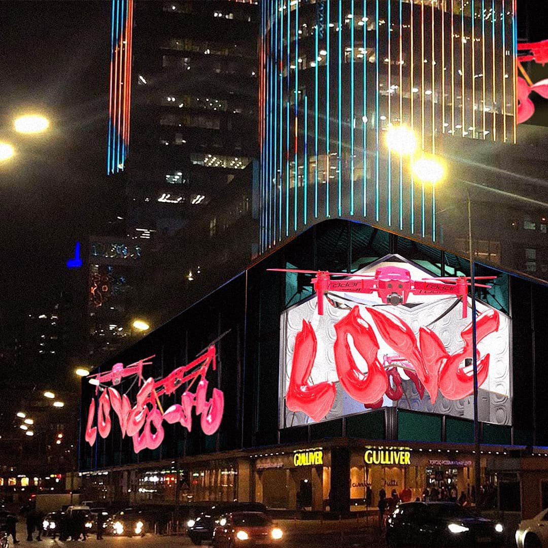 Ідея моушн-інсталяції полягає у сучасному переосмисленні вираження любові. Зараз люди все більше виявляють її за допомогою гаджетів та техніки. Але кохання існує, незважаючи на зміни навколо.