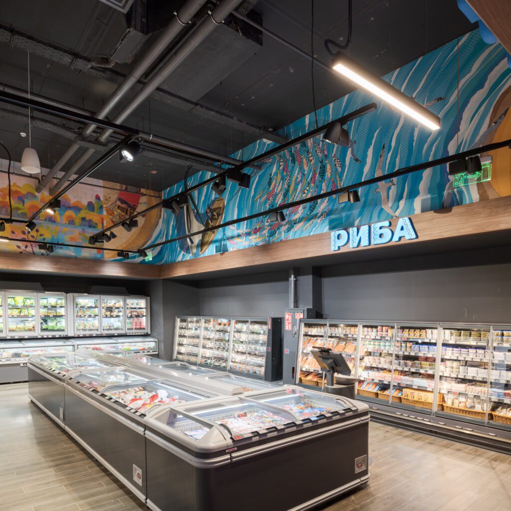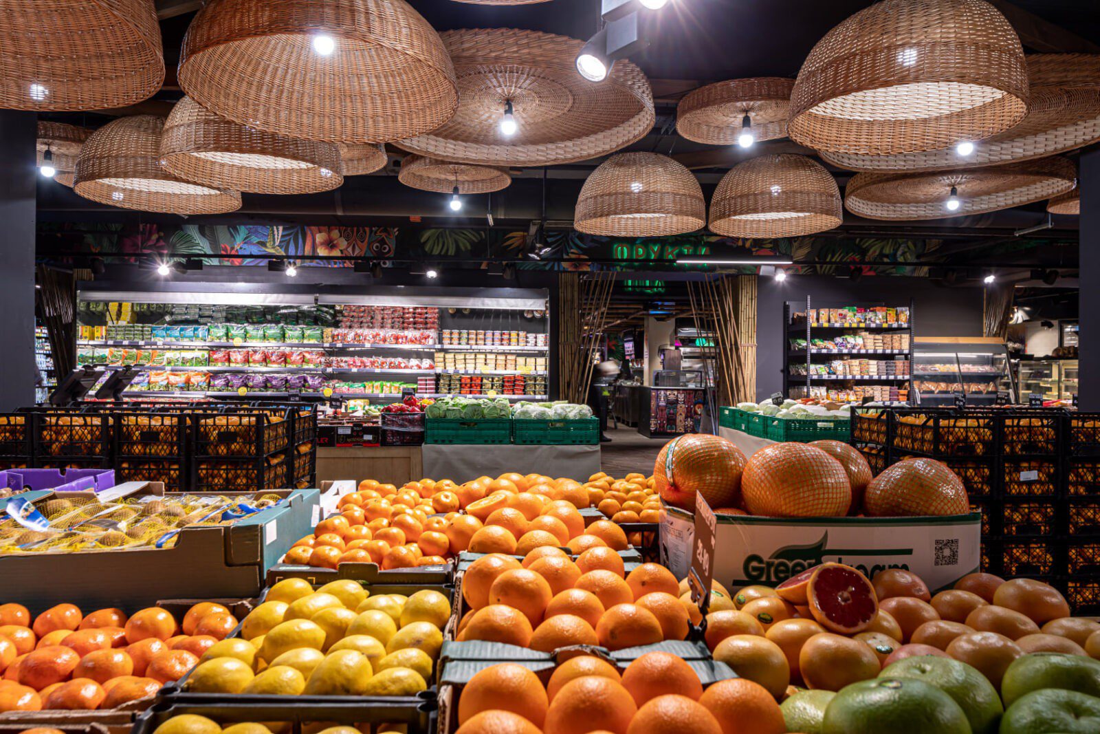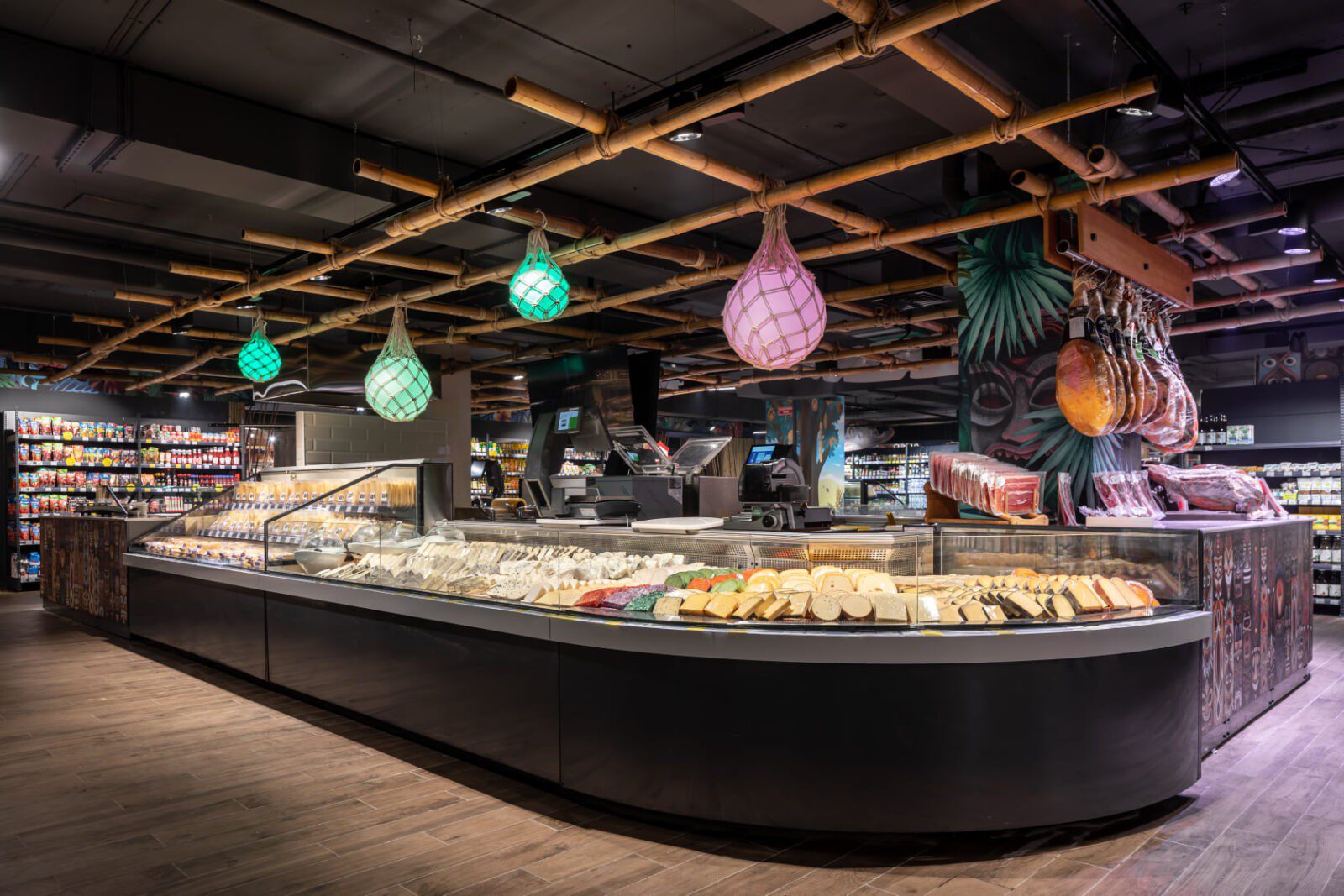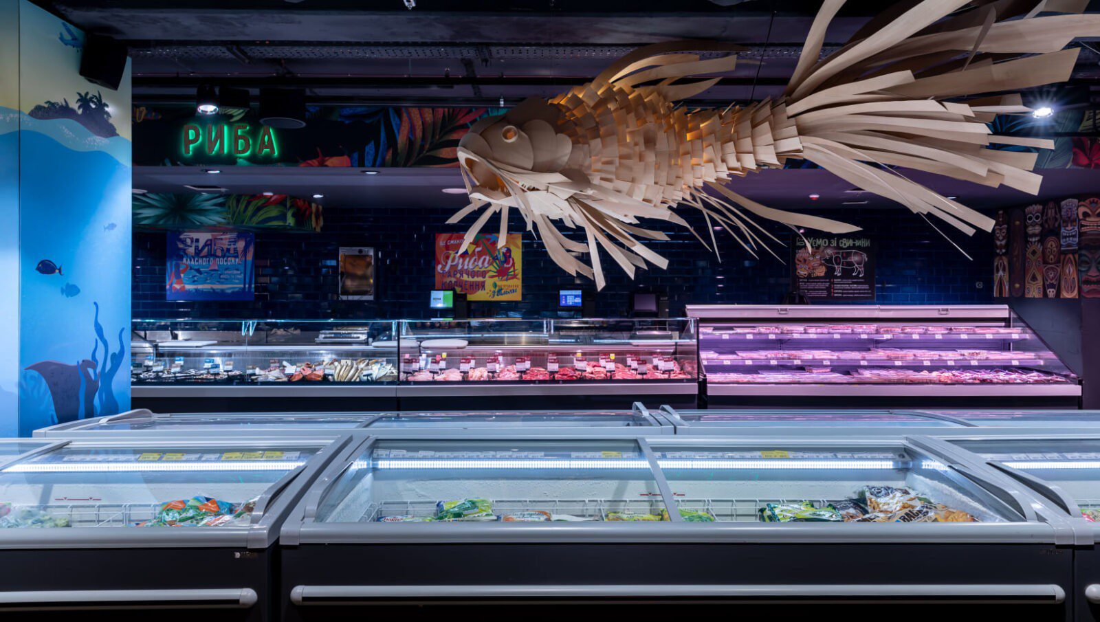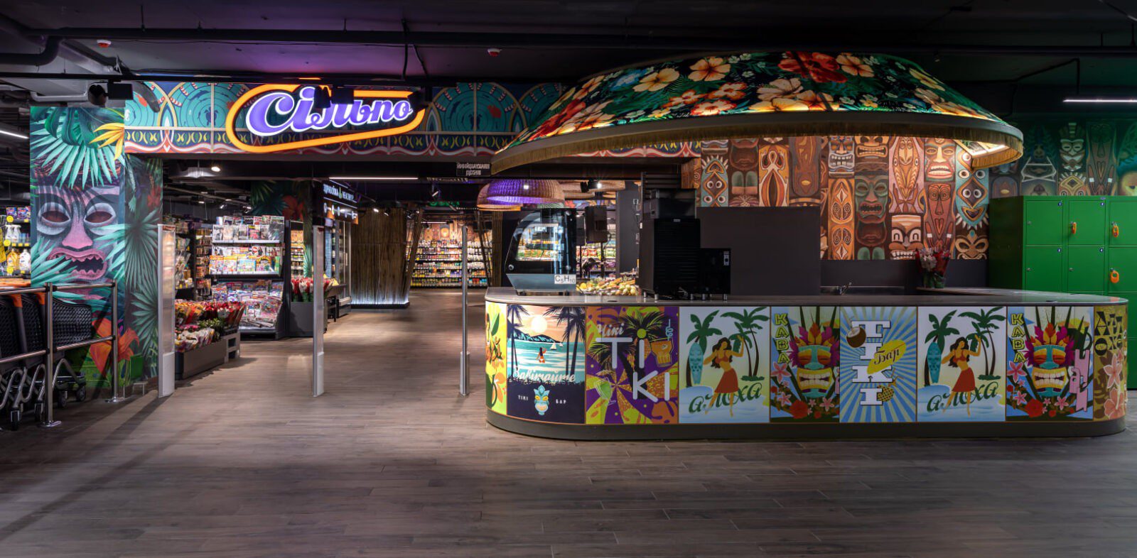 Надихнувшись культурою тихоокеанських островів, дизайнери створили стиль супермаркету, який перенесе відвідувачів за тисячі кілометрів. Тут і полінезійські орнаменти на стінах, і колони в бамбукових чагарниках, і лайтбокси у вигляді гавайських ліхтарів. А головна особливість оновленого магазину – тики – дерев’яні маски різних божеств. Вони тут представлені як ілюстрації на стінах, і як дерев’яні прикраси на колонах.