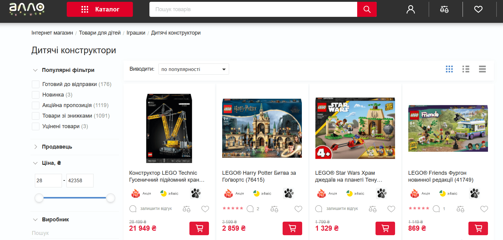 Найбільше впродовж року на allo.ua та у мобільному застосунку купували конструктори LEGO. Саме ця категорія товарів продемонструвала найбільше зростання за рік – у 4 рази у порівнянні з 2022-м.