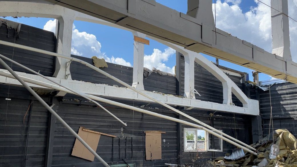Снаряд пробив дах центру. 14 липня рятувальники за допомогою крана зняли бетонні перекриття, які могли зруйнуватися.