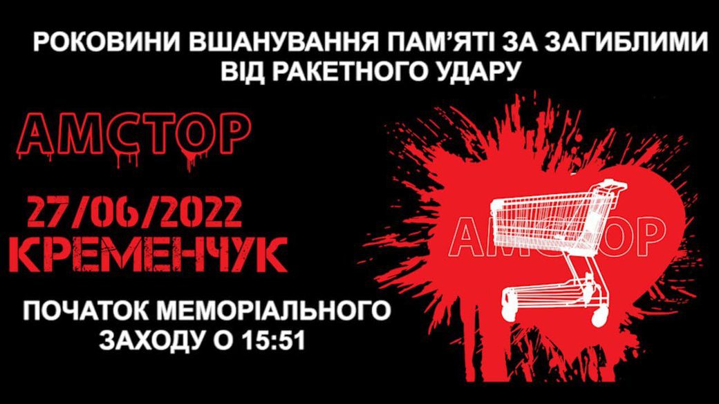 У Кременчуці Полтавської області 27 червня проведуть меморіальний захід на місці загибелі людей після ракетного удару по ТЦ "Амстор" рік тому.