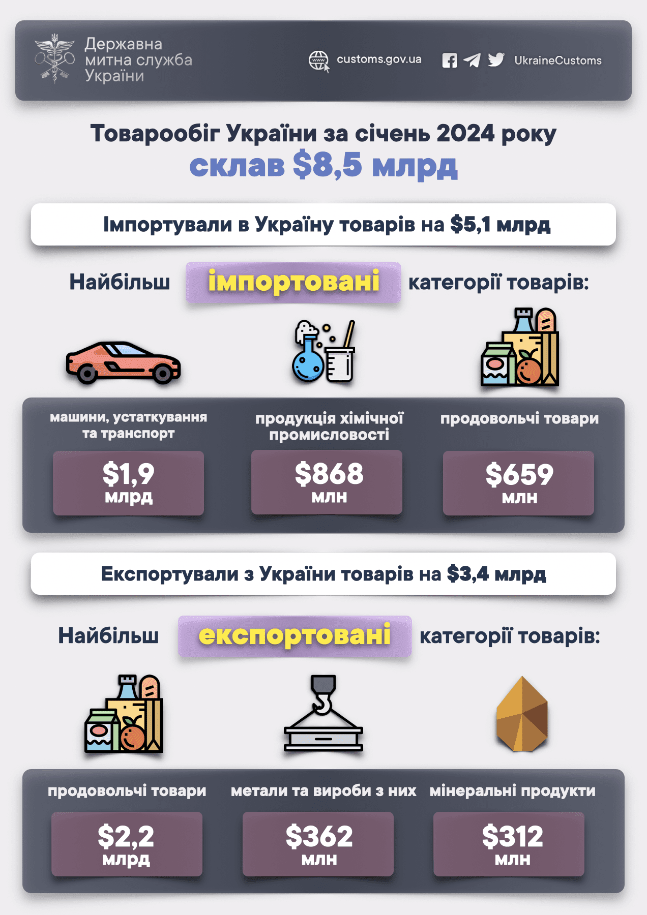 У січні 2024 року Україна збільшила товарообіг на 7%, порівняно з аналогічним періодом 2023-го. Показник сягнув 8,5 мільярда доларів.