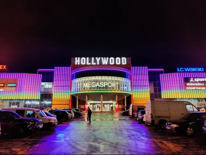 Днями ТРЦ Голлівуд у Чернігові засвітився новими фарбами — на фасаді торгового центру встановили декоративне підсвічування.