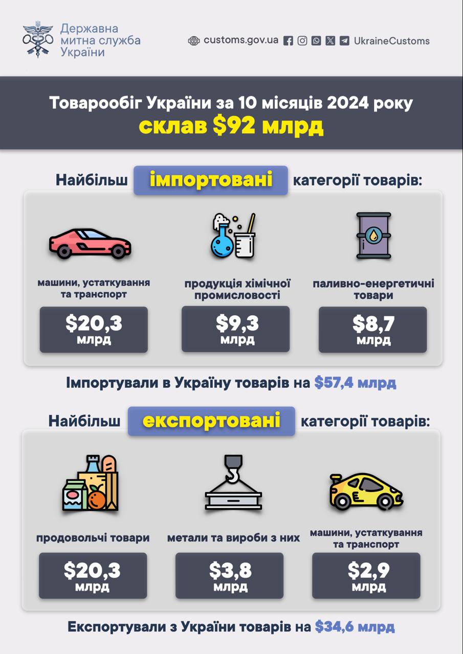 За 10 місяців 2024 року товарообіг України склав 92 млрд доларів, з січня по жовтень в країну імпортували товарів на суму 57,4 млрд доларів, а експортували – на 34,6 млрд доларів.