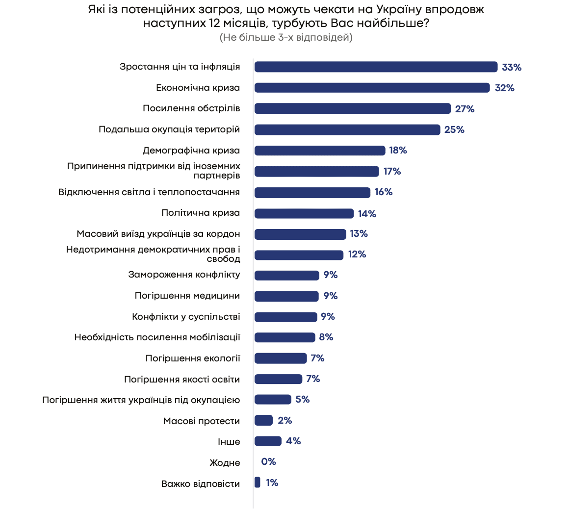 На третьому році повномасштабної війни українці вважають зростання цін та поглиблення економічної кризи більшою загрозою, ніж посилення обстрілів.
