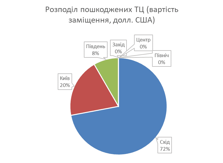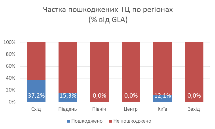 З точки зору пошкоджених ТЦ за площею найбільш постраждалим регіоном є також Схід. Тут постраждали 37% усіх торгових площ регіону. Далі йде південь – 15,3%. Пощастило регіону Північ. Незважаючи на активні бойові дії, значних ушкоджень не отримав жоден ТЦ. У Центрі та Заході так само.