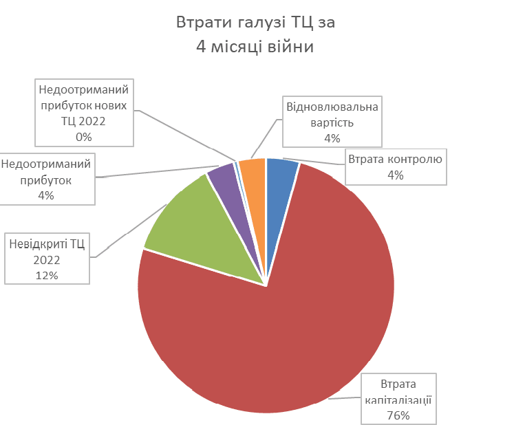 Найбільшу частку непрямих втрат (74%) займають втрати капіталізації існуючих ТЦ. Це пов’язано з підвищенням ставок капіталізації з 11-13% у середньому у 2021 році до 17-19% у 2022 році. Сума втрат може бути навіть більшою, тому що ринку зараз не існує і визначити ці цифри дуже складно. Також значні втрати (1,2 млрд дол) вітчизняні компанії отримали внаслідок зупинки будівництва 19 ТЦ, які мали відкритися у 2022 році. Зупинилося проектування та будівництво ще багатьох ТЦ, які мають відкритися у 2023-2024 рр., але зараз ця кількість не прорахована.