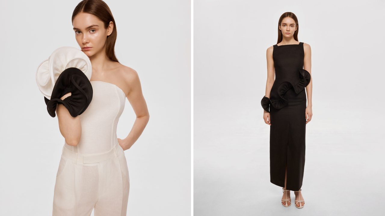 Колекція виконана в трьох кольорах — класичному чорному, білому та бежевому, що підкреслюють графічність форм і не відволікають від силуету та фактури.