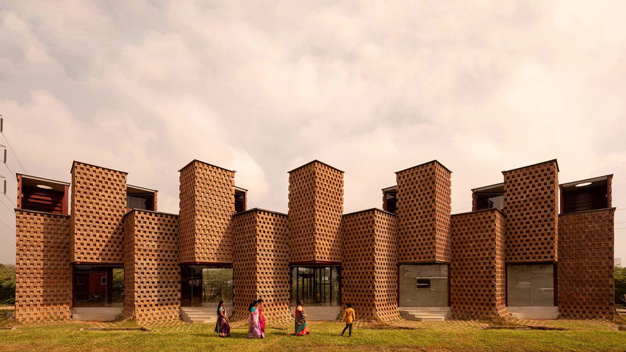 Архітектори використали списані морські контейнери як основу для будівлі: дванадцять контейнерів розрізали вздовж навпіл і приварили до сталевого каркаса. Це створило зигзагоподібні стіни, які згодом покрили перфорованою решіткою з утрамбованої землі.