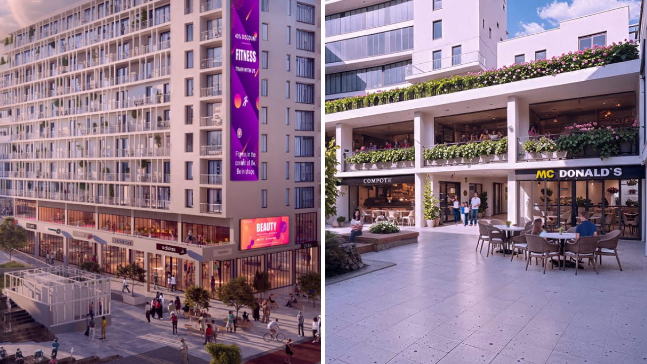 Комерційні площі розташовані на двох відкритих озеленених поверхах із доступом для мешканців житлових містечок ZEZMAN та клієнтів, завдяки поєднанню багаторівневих пішохідних зон ліфтами та ескалаторами