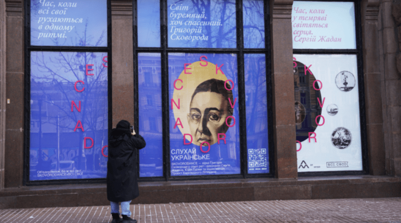 Вітрини оформили в рамках проєкту SKOVORODANCE, у якому сучасні українські митці, зокрема Сергій Жадан, Юрій Гуржи, Ірена Карпа та Олег Каданов, виконали покладені на музику й адаптовані до сьогодення вірші Сковороди.