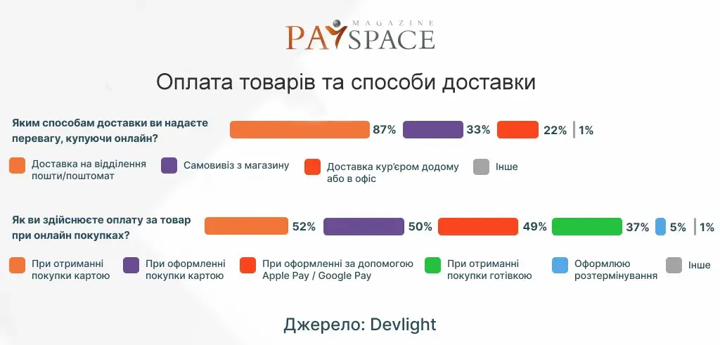 Щодо доставки, найчастіше українці замовляють її на поштові відділення та поштомати та обирають оплату карткою при отриманні товару.