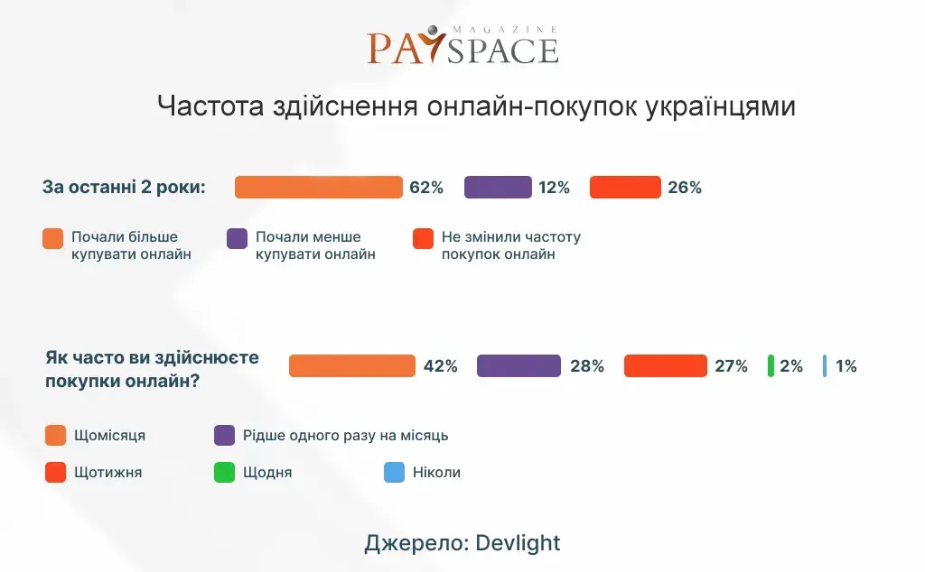 За останні два роки 62% українців збільшили частоту покупок онлайн. 12% почали купувати менше товарів, а у 26% опитаних нічого не змінилось.
