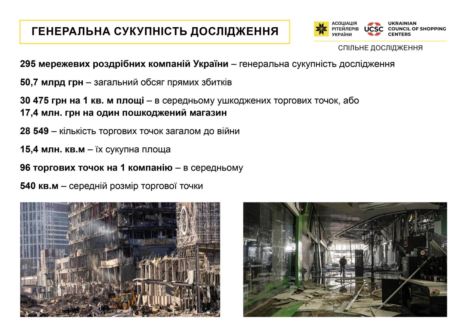 Генеральну сукупність дослідження становили 295 провідних роздрібних мереж України. Загальний обсяг прямого збитку торгової сфери оцінюється в 50,7 млрд. грн. У середньому виходить за 30 475 грн на 1 кв. м площі пошкоджених торгових точок або 17,4 млн. грн. на один пошкоджений магазин.