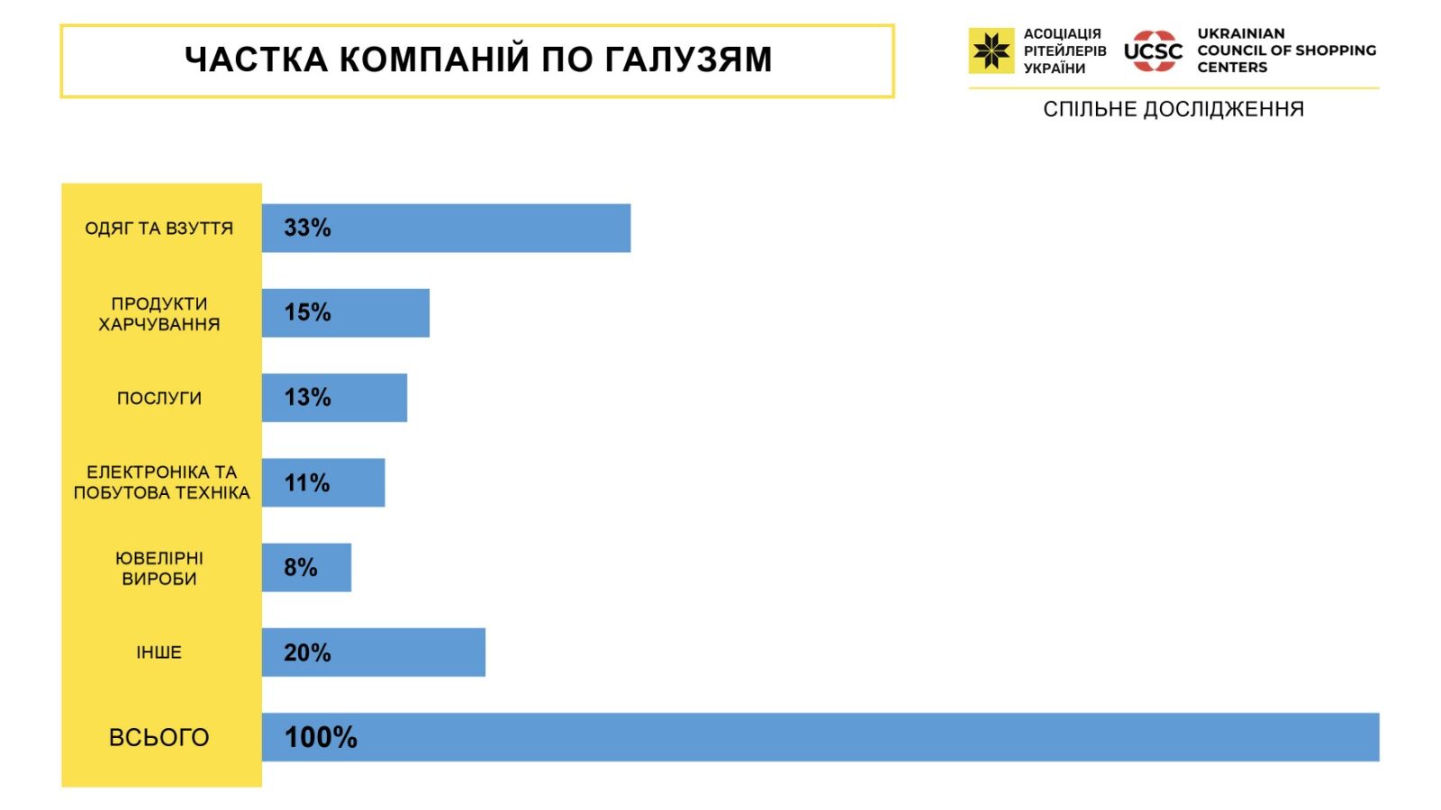 Якщо дивитися за товарними категоріями, добре видно, що третина компаній — продавці одягу та взуття (33%), включаючи спортивний та дитячий асортимент. На другому місці FMCG-оператори з часткою 15%. Третє місце за різними послугами (13%). Але при цьому потрібно враховувати, що інші види торгівлі, які не увійшли до основних категорій, — це п’ята частина компаній. Частка торгівлі електронікою та побутовою технікою становить 11%, ювелірка – 8%.