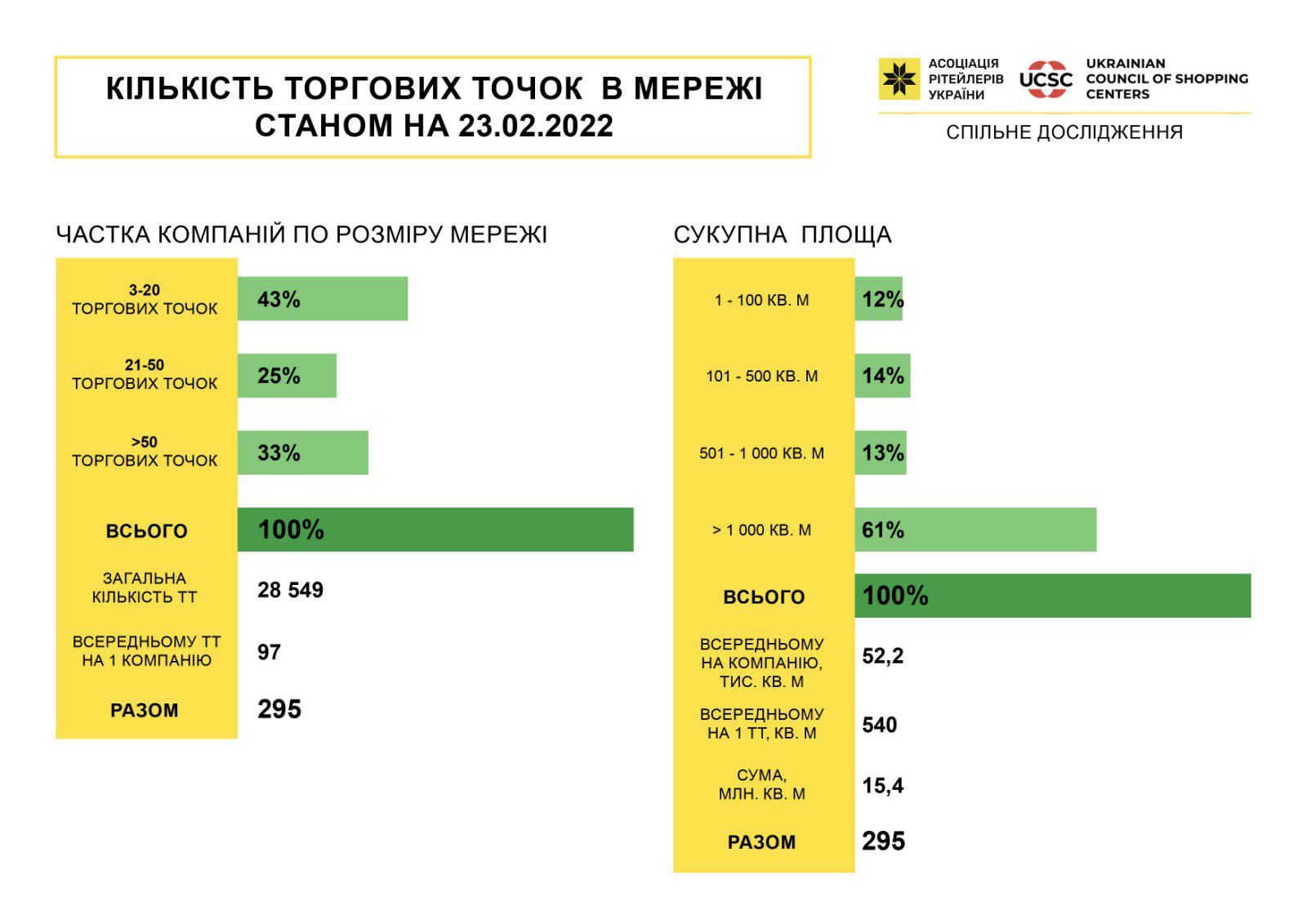 Дані компанії представляють 28549 магазинів площею 15,4 млн кв. м, які працювали в Україні за станом на 24.02.2022 року. Тобто в середньому 96 торгових точок на одну компанію, середній розмір торгової точки — 540 кв. м.