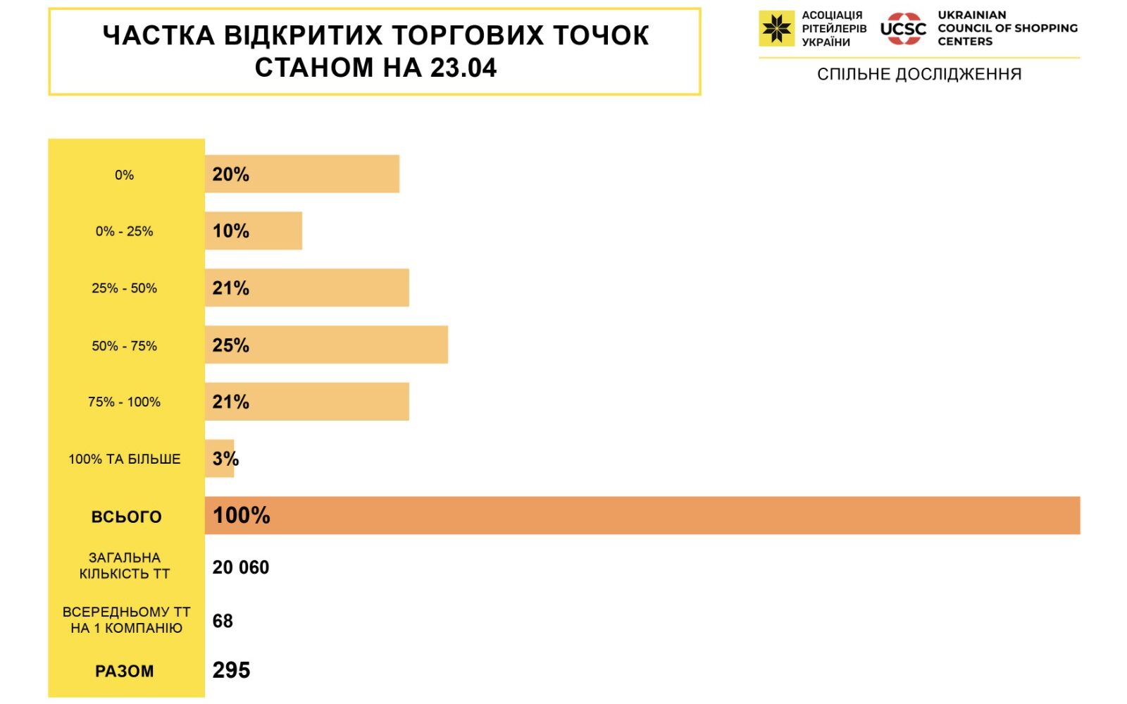 Через два місяці після початку бойових дій продовжували працювати 20 060 магазинів загальною площею 11,4 млн. кв. м. Тобто лише 70% від довоєнної кількості точок (28 549) та 74% від обсягу довоєнної площі (15,4 млн кв. м). У середньому кожна компанія відкрила 68 торгових точок. П’ята частина мереж була закрита взагалі, у 10% компаній працювало не більше чверті магазинів, а у 21% мереж — не більше половини. Лише 3% ритейлерів мали змогу не лише працювати на повну, а й відкривати нові торгові точки.