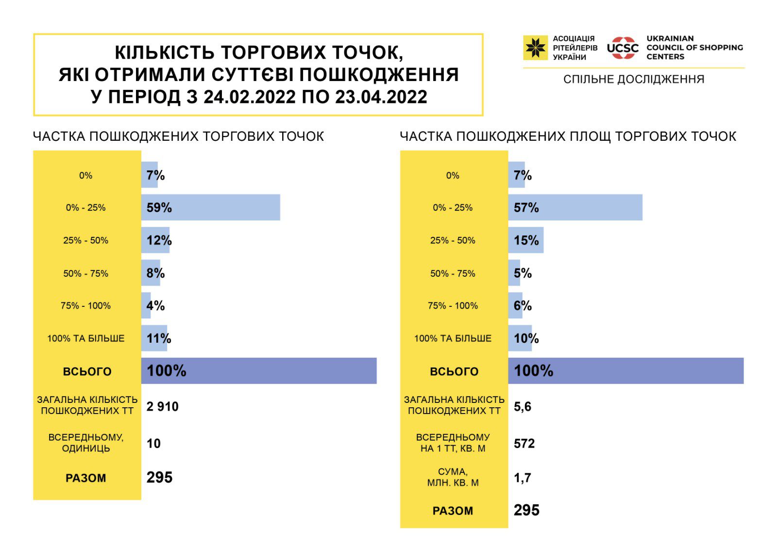 У ході бойових дій за два місяці істотних збитків було завдано 2910 торгових точок площею 1,7 млн кв. м. Тобто в середньому кожна мережа мала втрати по 10 магазинів або 572 кв. м на кожен. Приблизно 60% мереж мали пошкодження у чверті своїх магазинів, а десята частина компаній взагалі втратила можливість працювати.