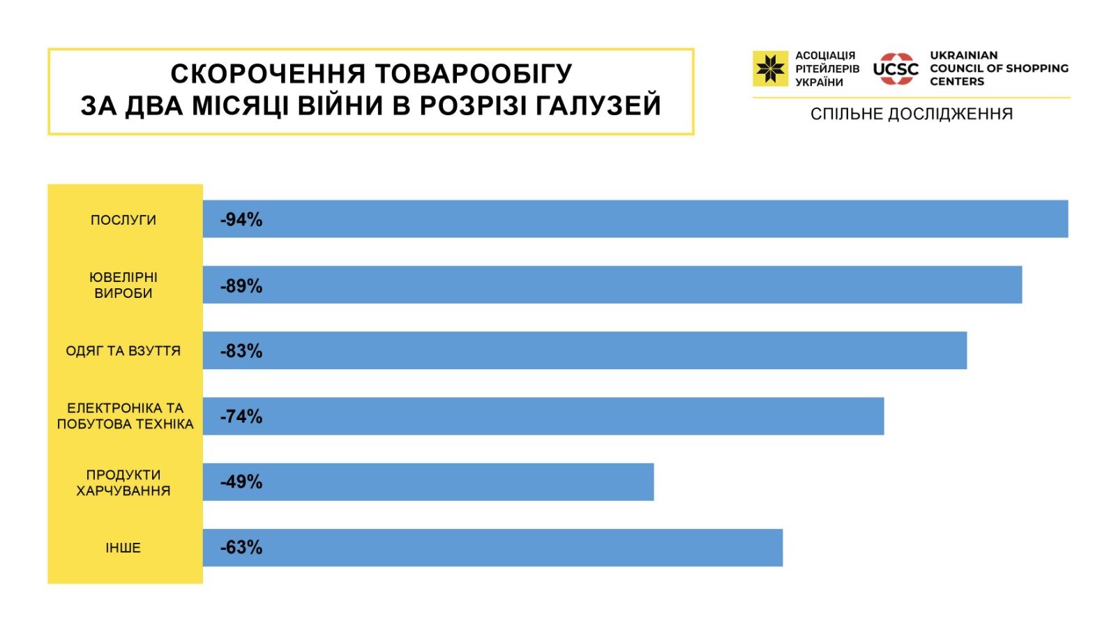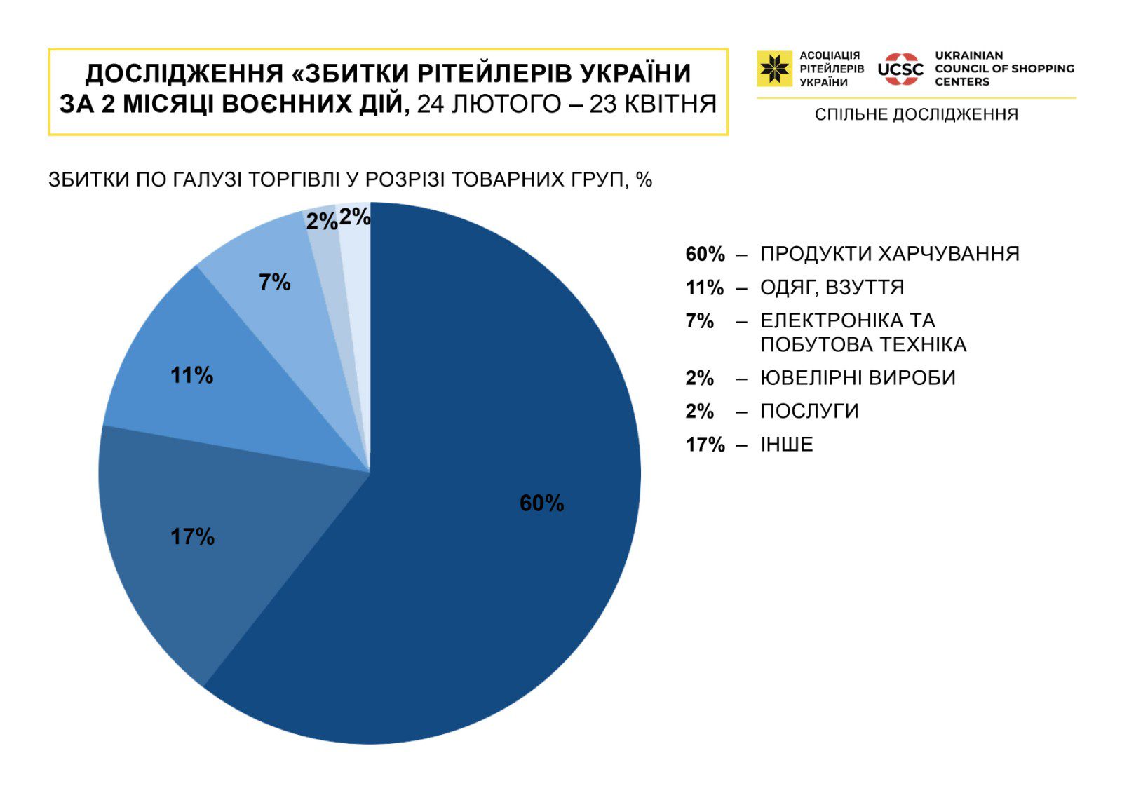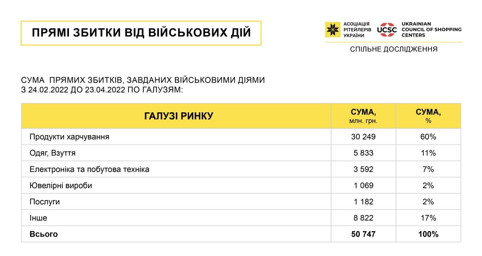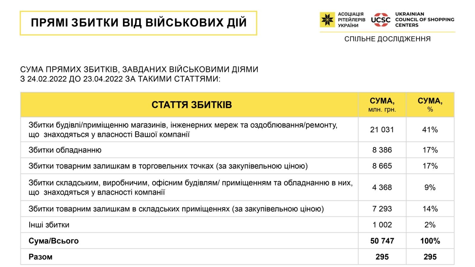 У травні Асоціація ритейлерів України та Українська рада торгових центрів (УРТЦ) провели дослідження, що охопило 295 торгових компаній — великих мереж та малих підприємців. Загальна цифра втрат за цими мережевими ритейлерами становить 50,7 млрд грн.