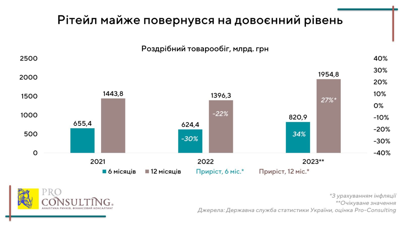 За оцінкою компанії Pro-Consulting, український ритейл майже повернувся на довоєнний рівень. Очікується, що за результатами цього року приріст товарообігу з урахуванням інфляції складатиме 27%.