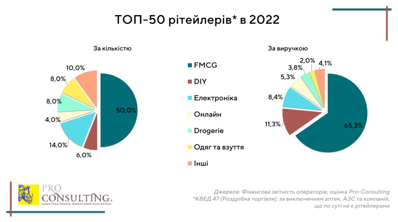 Беззаперечним лідером серед сегментів як за кількістю мереж, так і за виручкою, є FMCG, друге та третє місця за виручкою посідають DIY та Електроніка.